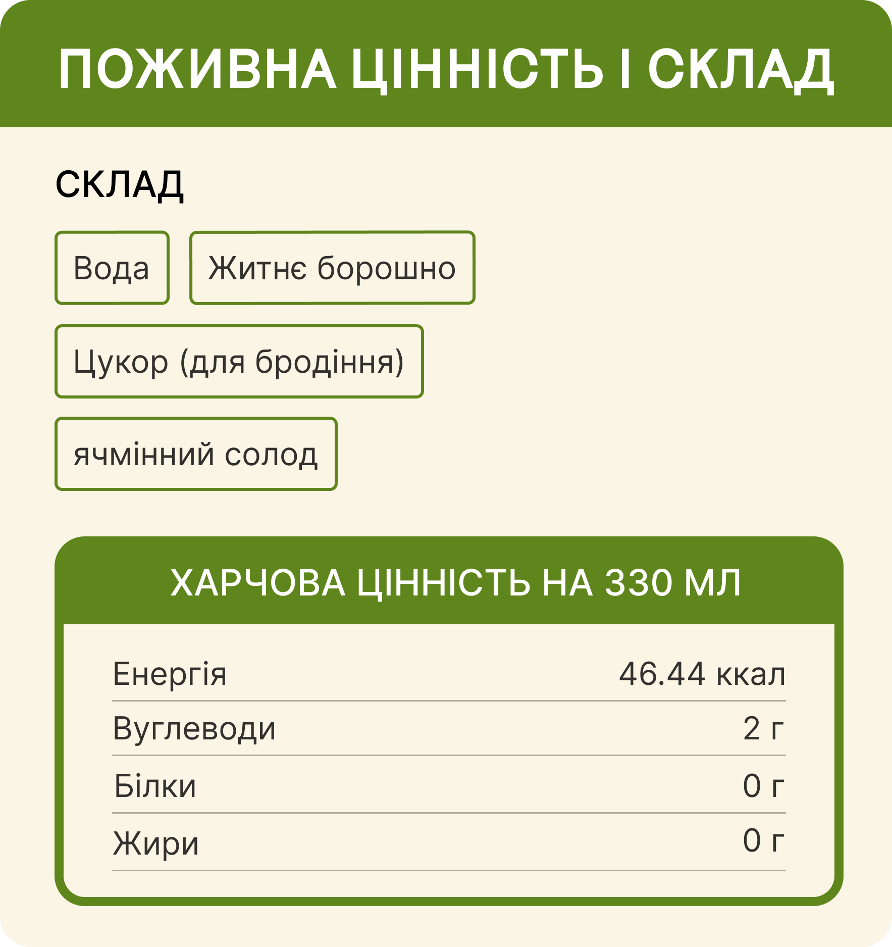 Вода, цукор, концентрований сік яблука, житнє борошно, ферментований житній солод, ячмінний солод світлий, сухі дріжджі, лимонна кислота